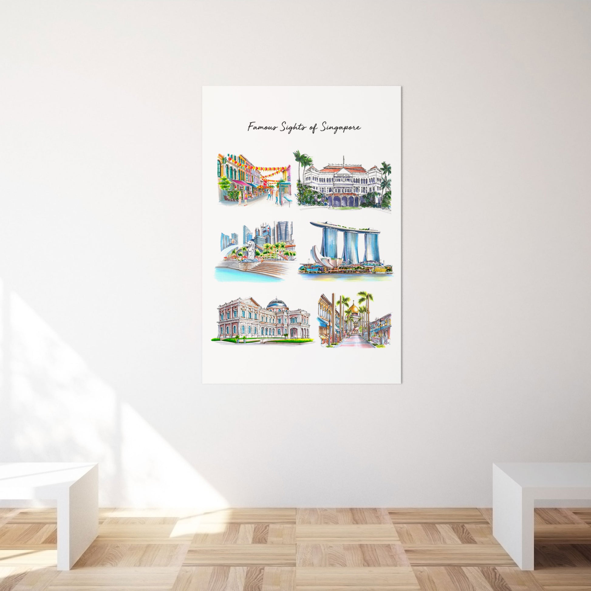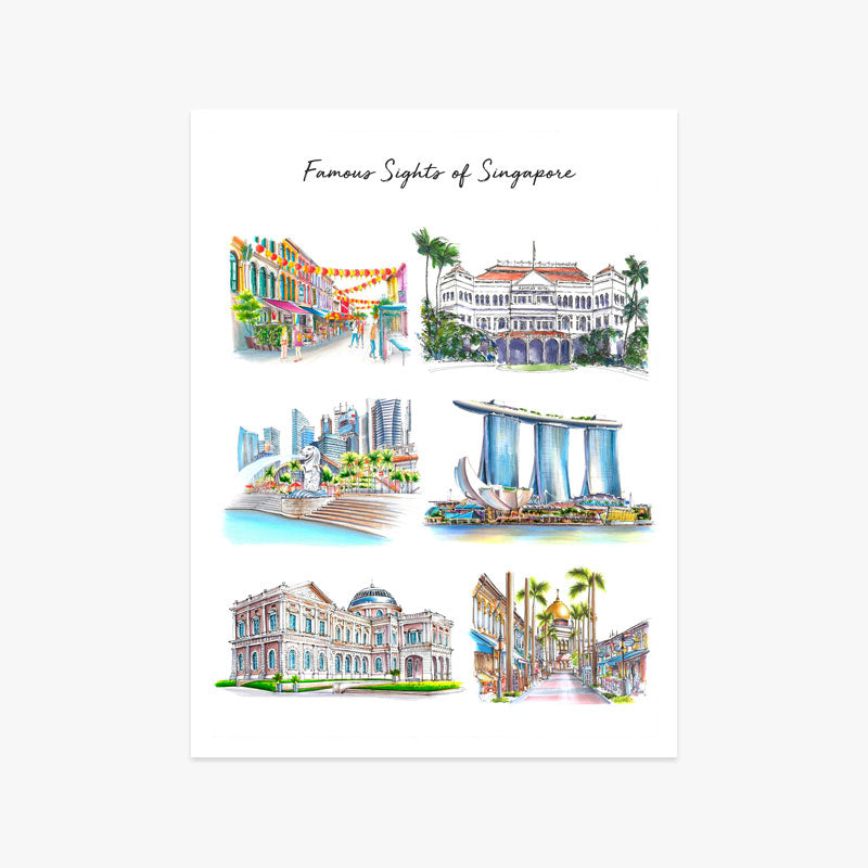 Bringing the best of our 6 famous sights in a collage print - Emerald Hills, Fullerton Hotel, Raffles Hotel, Merlion, Haji Lane and Marina Bay Sands.