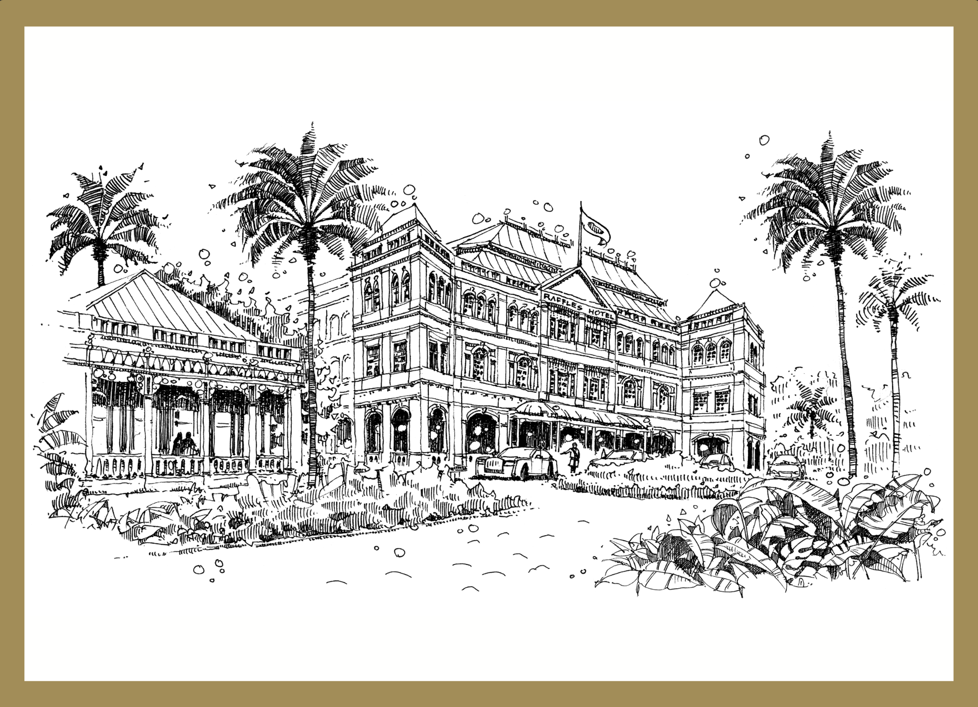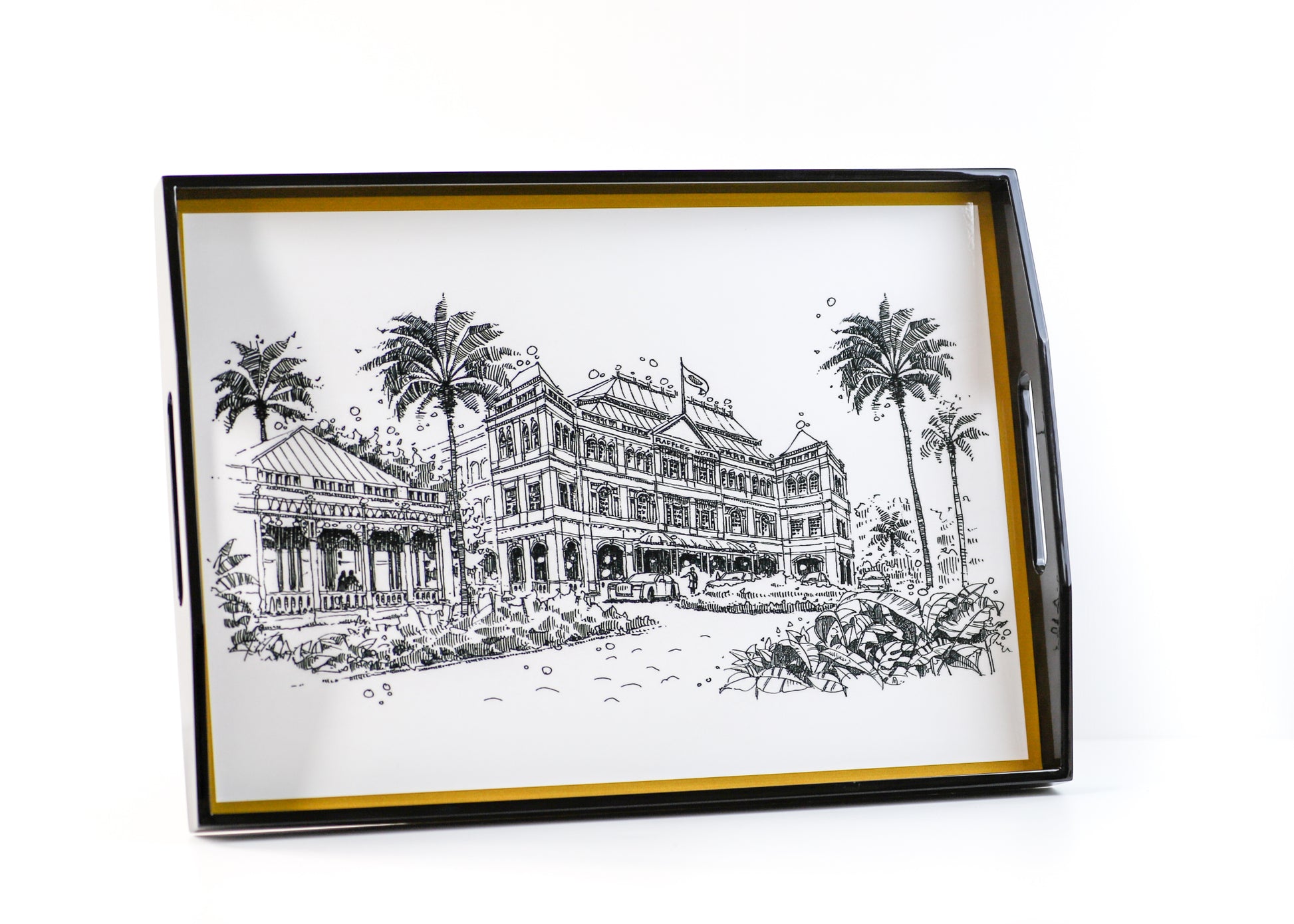 This black lacquer tray manufactured from Vietnam is a show stopping piece for your home and it is made to last. It will make a fabulous timeless gift - be it a welcome, leaving or a special occasion gift. The illustrations on the tray consists the best of 8 black & white houses from our collection. The detailing of our hand drawn Raffles Hotel in black & white.