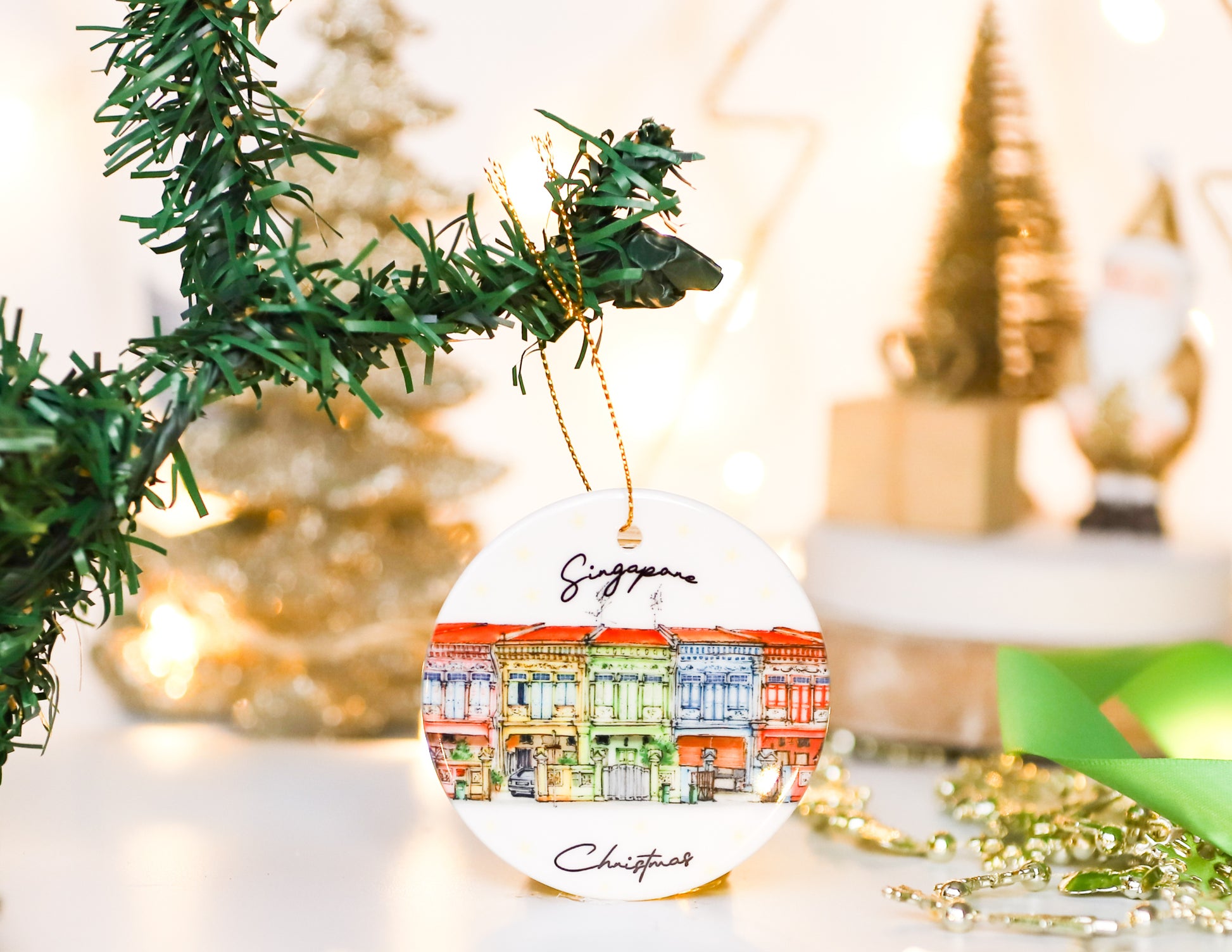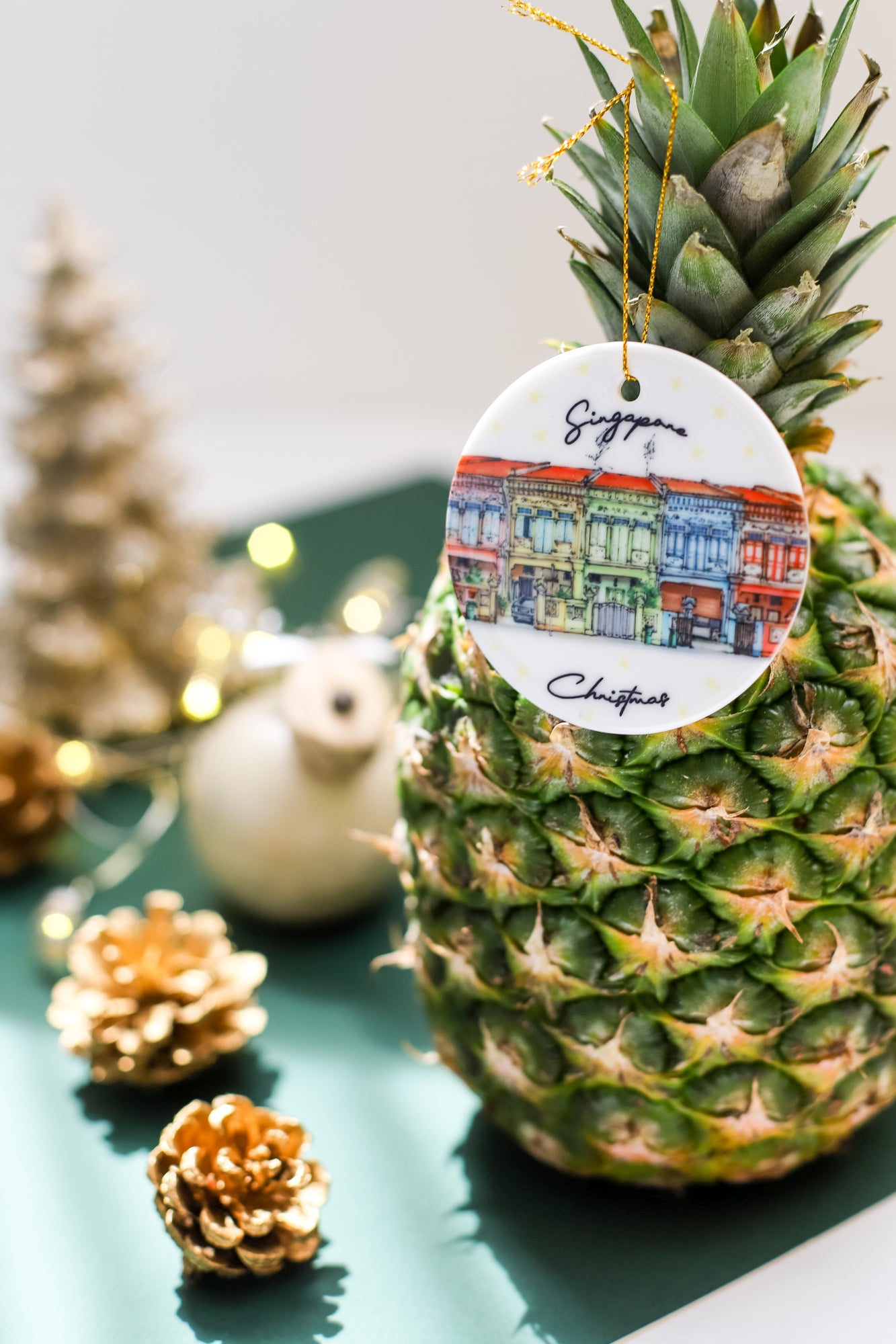 Beautiful ceramic Christmas tree decorations 3 inches by 3 inches from Gingerlily - featuring an illustration of the colourful Koon Seng road shophouses. Comes with red pouch - suitable for gifting.