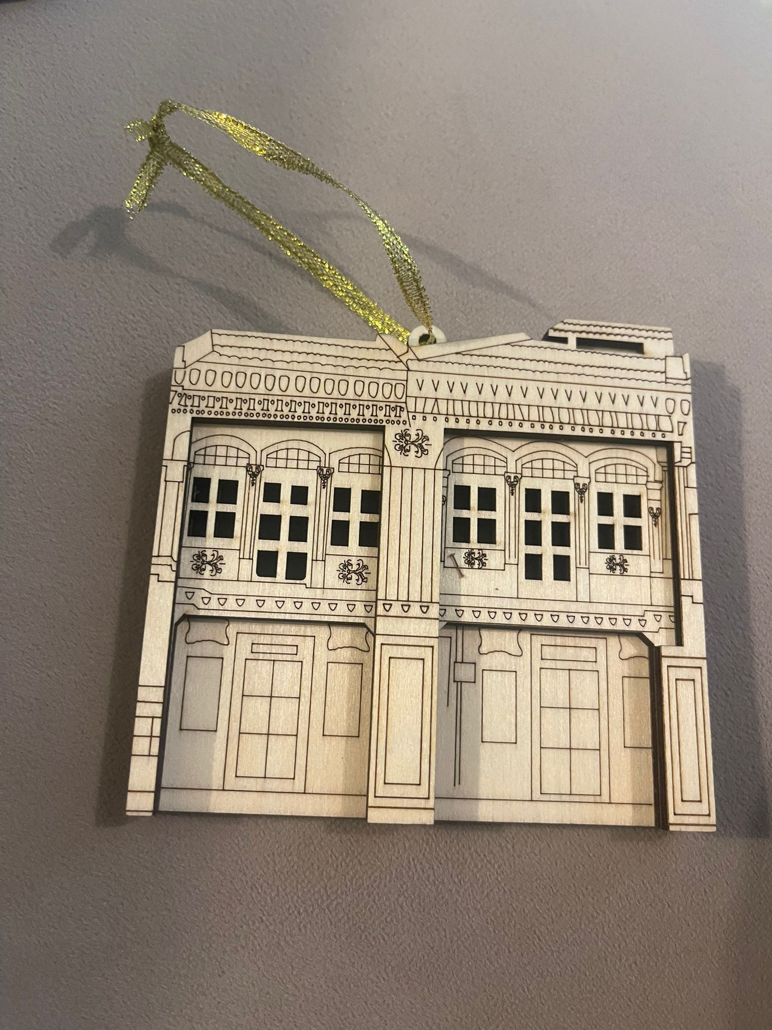 Beautiful basswood Christmas tree decoration from Gingerlily - featuring a shophouse - A distinct type of terraced building, typically two to three stories high, that were historically used for both residential and commercial purposes. Suitable for gifting.