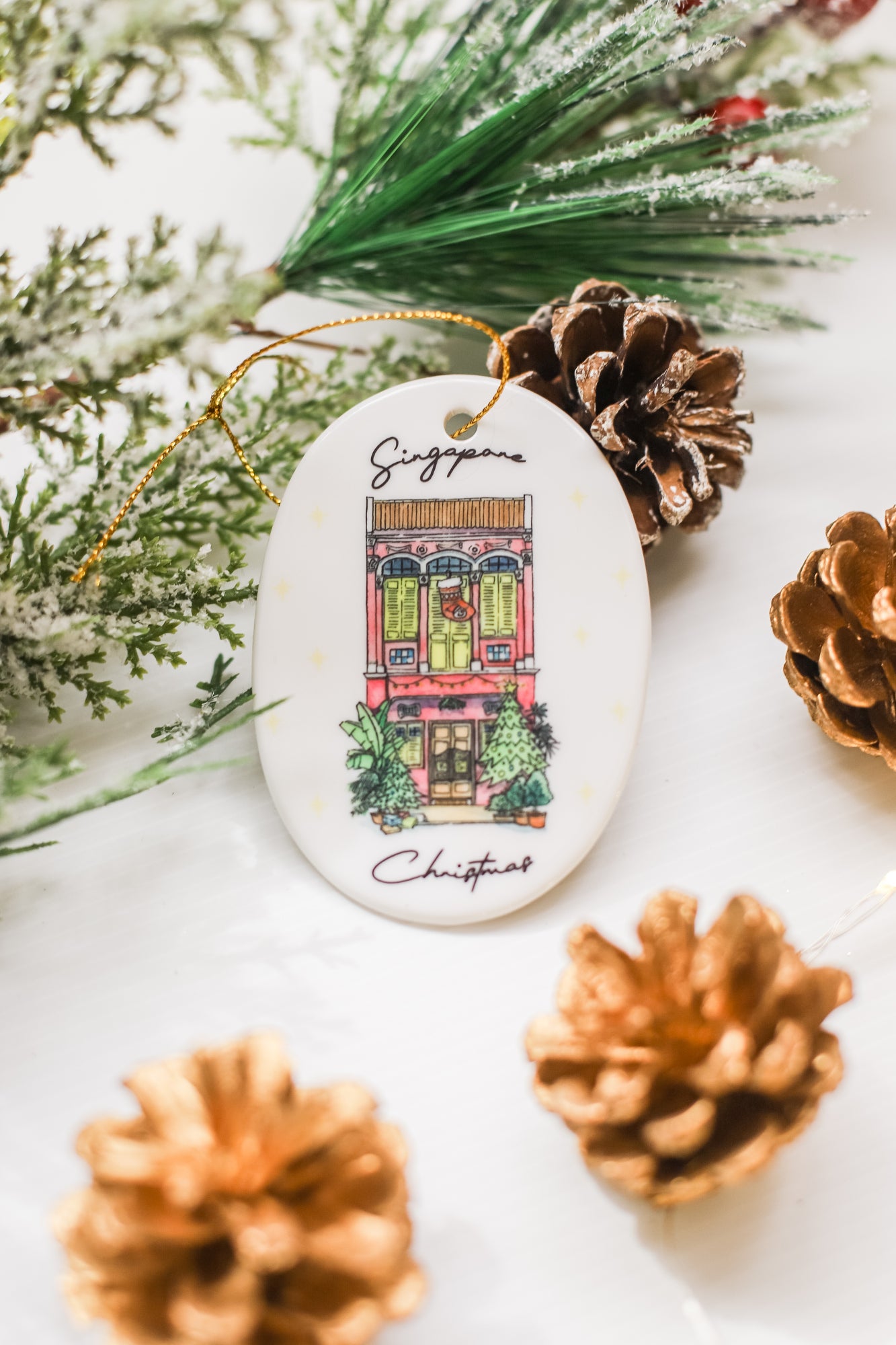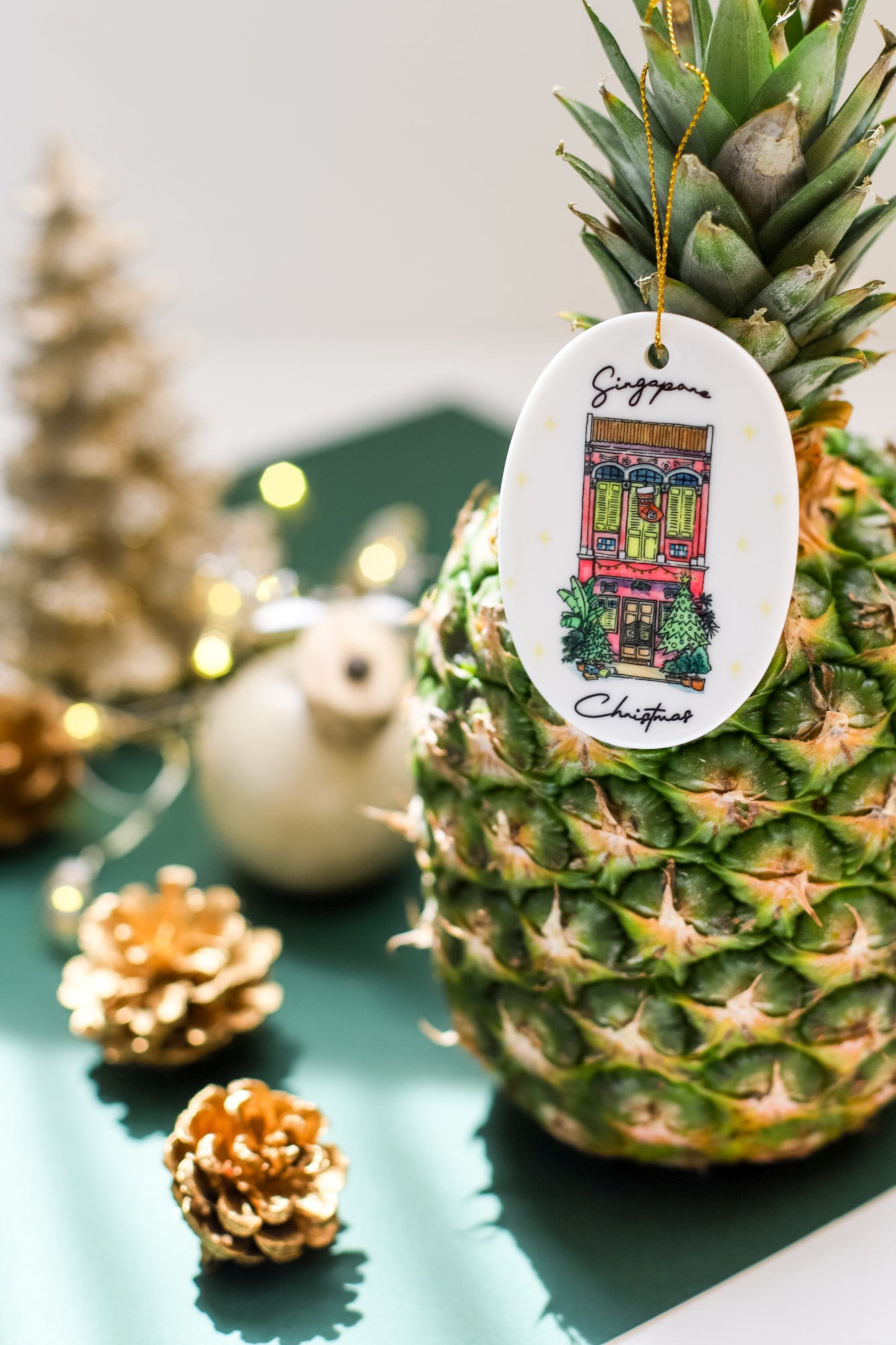 Oval ceramic ornament measuring 2 by 3 inch. This is from a series of 4 Peranakan houses. Can be bought separately or as a complete set.