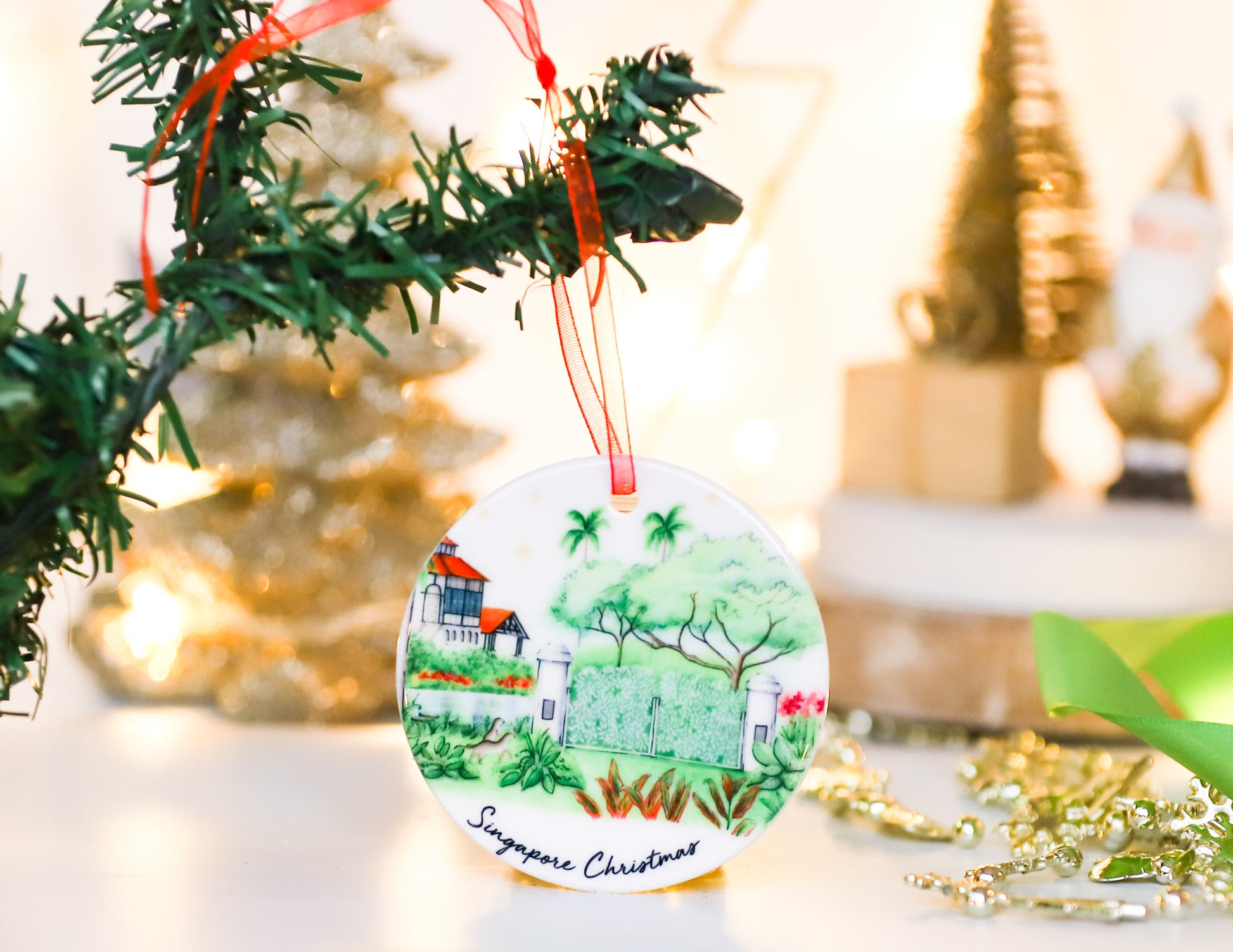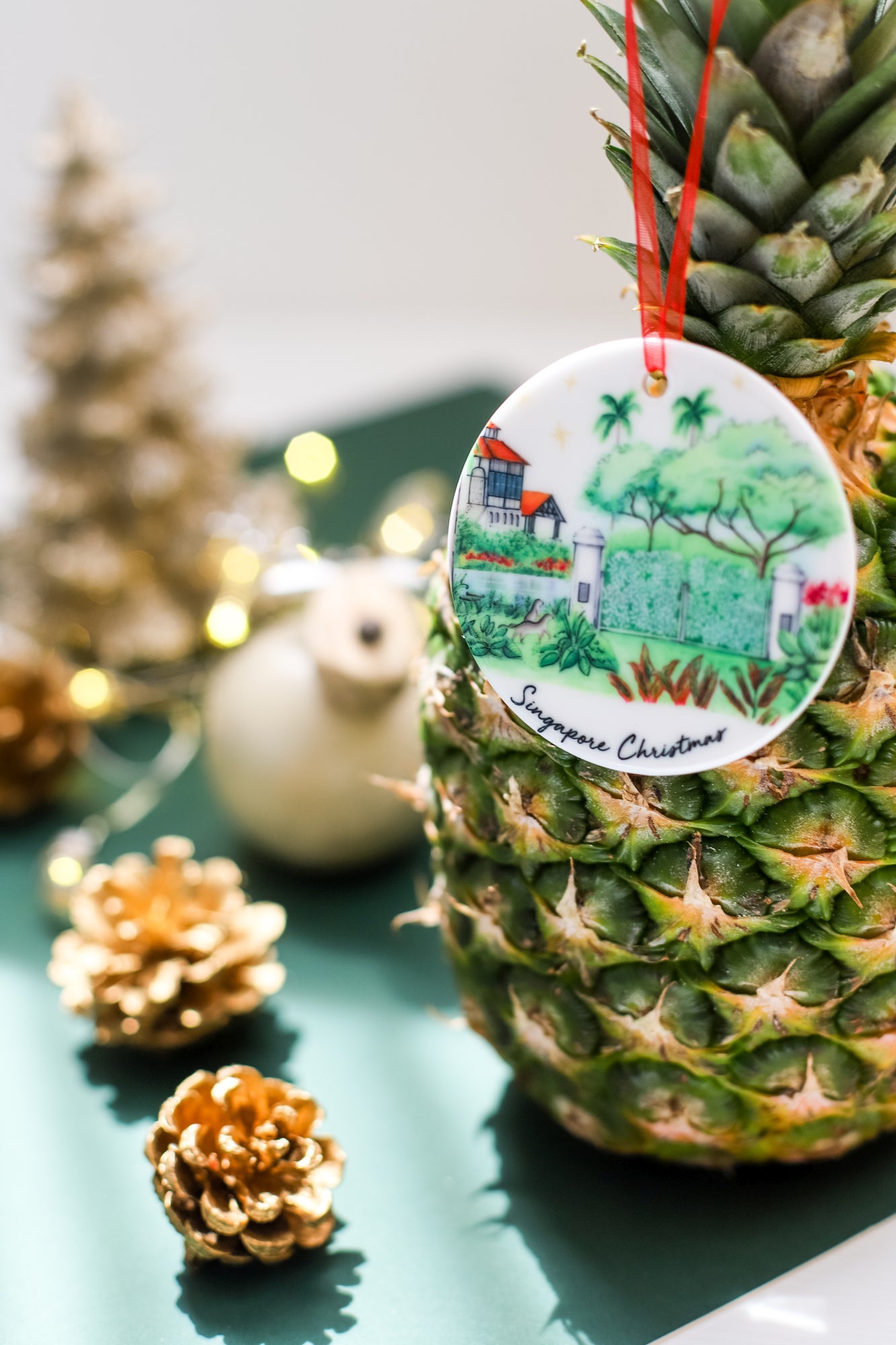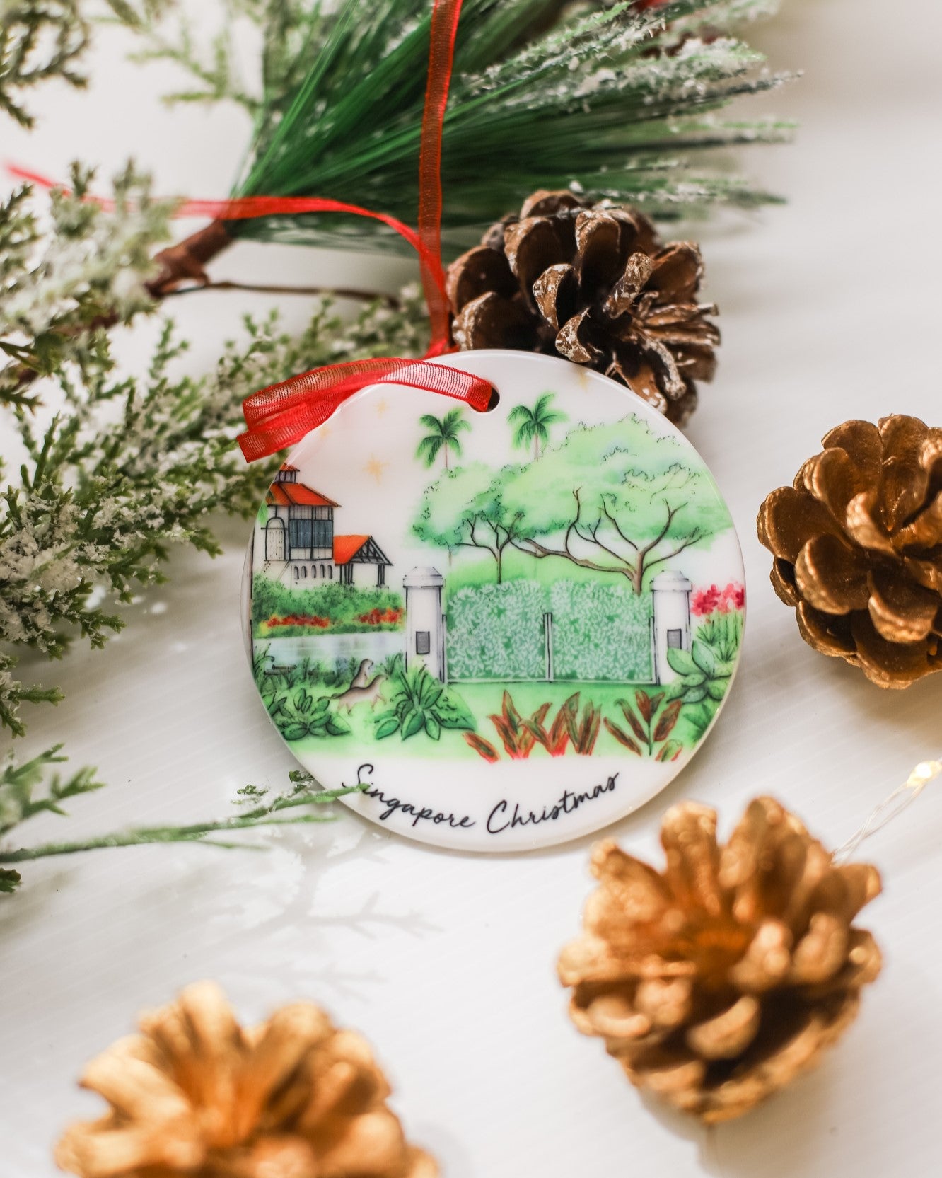 Beautiful ceramic Christmas tree decorations 3 inches by 3 inches from Gingerlily - featuring an illustration of the Botanic Gardens Front Gate, Singapore. We have added one of the black and white buildings within the garden compound, a group of otters commonly seen roaming around and some orchids best grown in the tropics. Comes with red pouch - suitable for gifting