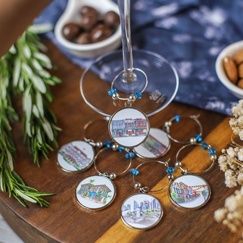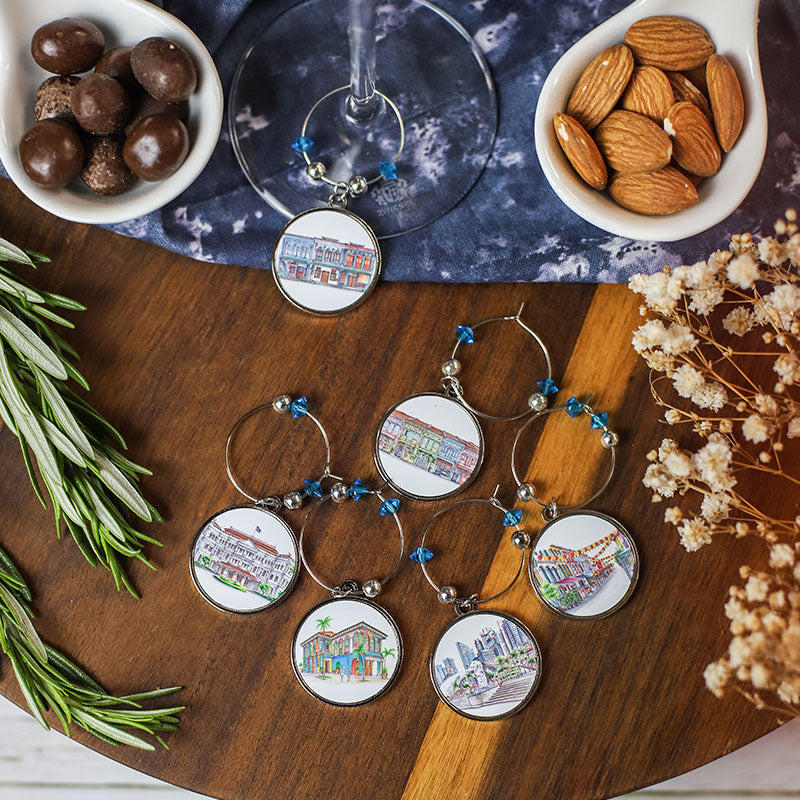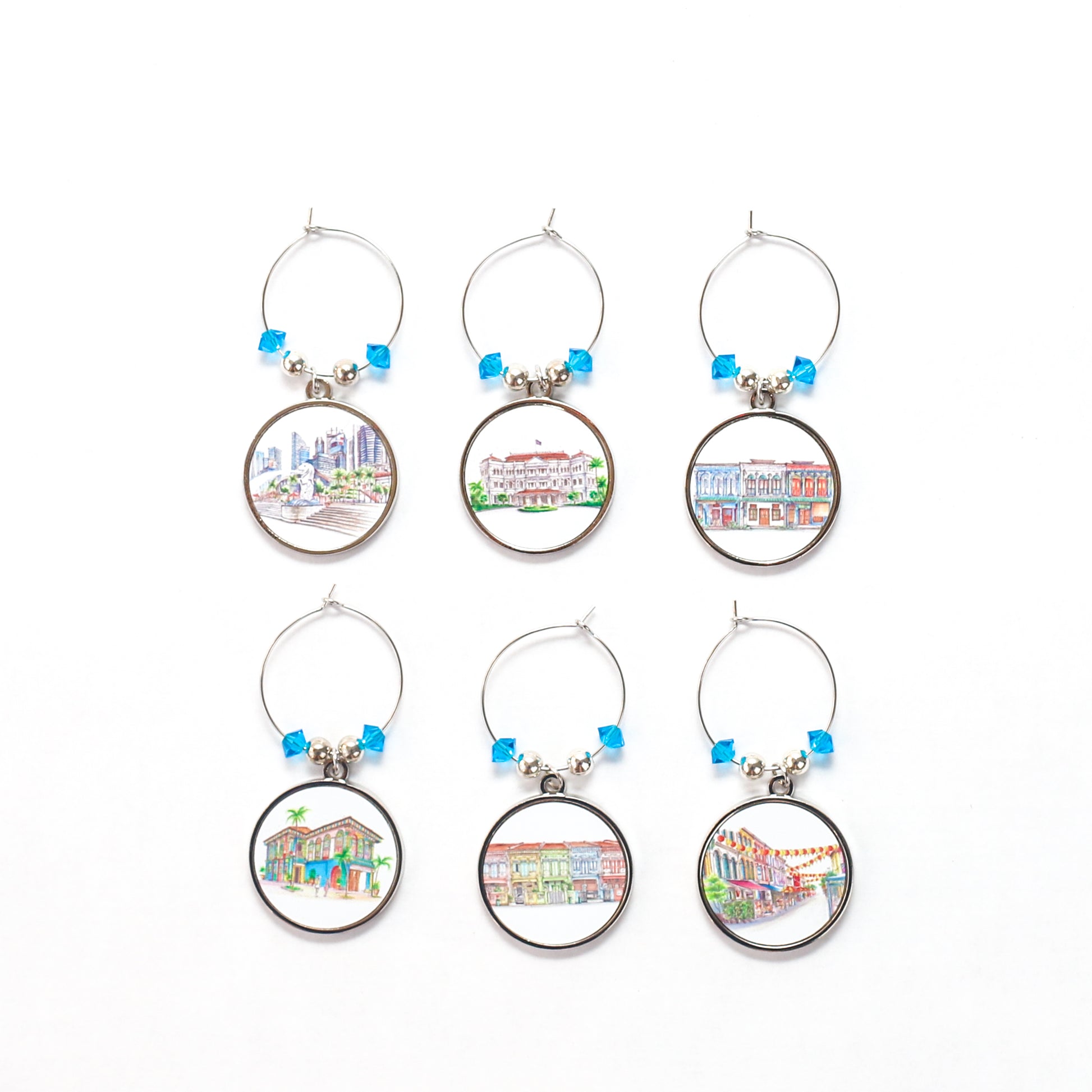 Singapore heritage themed wine charms from Gingerlily - featuring a selection of illustrations of Singapore landmarks (Raffles Hotel, Arab Street by Haji Lane, Merlion, Singapore River by Clark Quay & Black and White House) as colourful unique wine charms and markers.