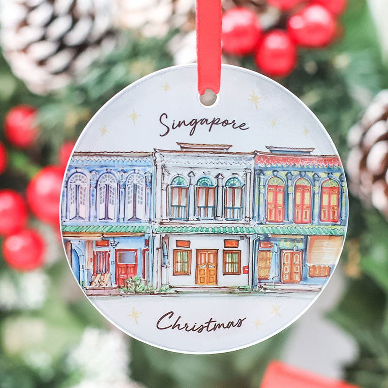 Beautiful coloured glass Christmas tree decoration 3 inches by 3 inches from Gingerlily - featuring a bright colourful illustration of Emerald Hills colourful shophouses. Comes packed with a red pouch - suitable for gifting.
