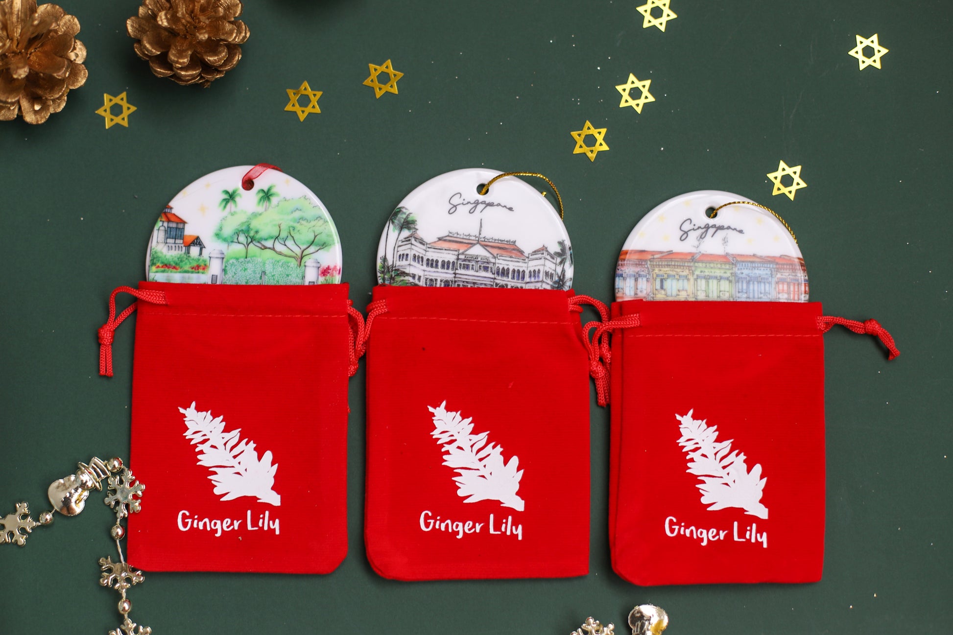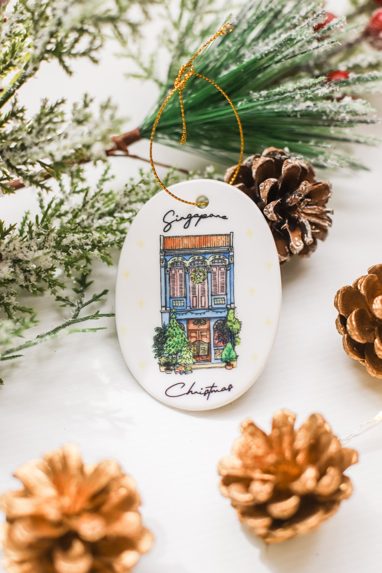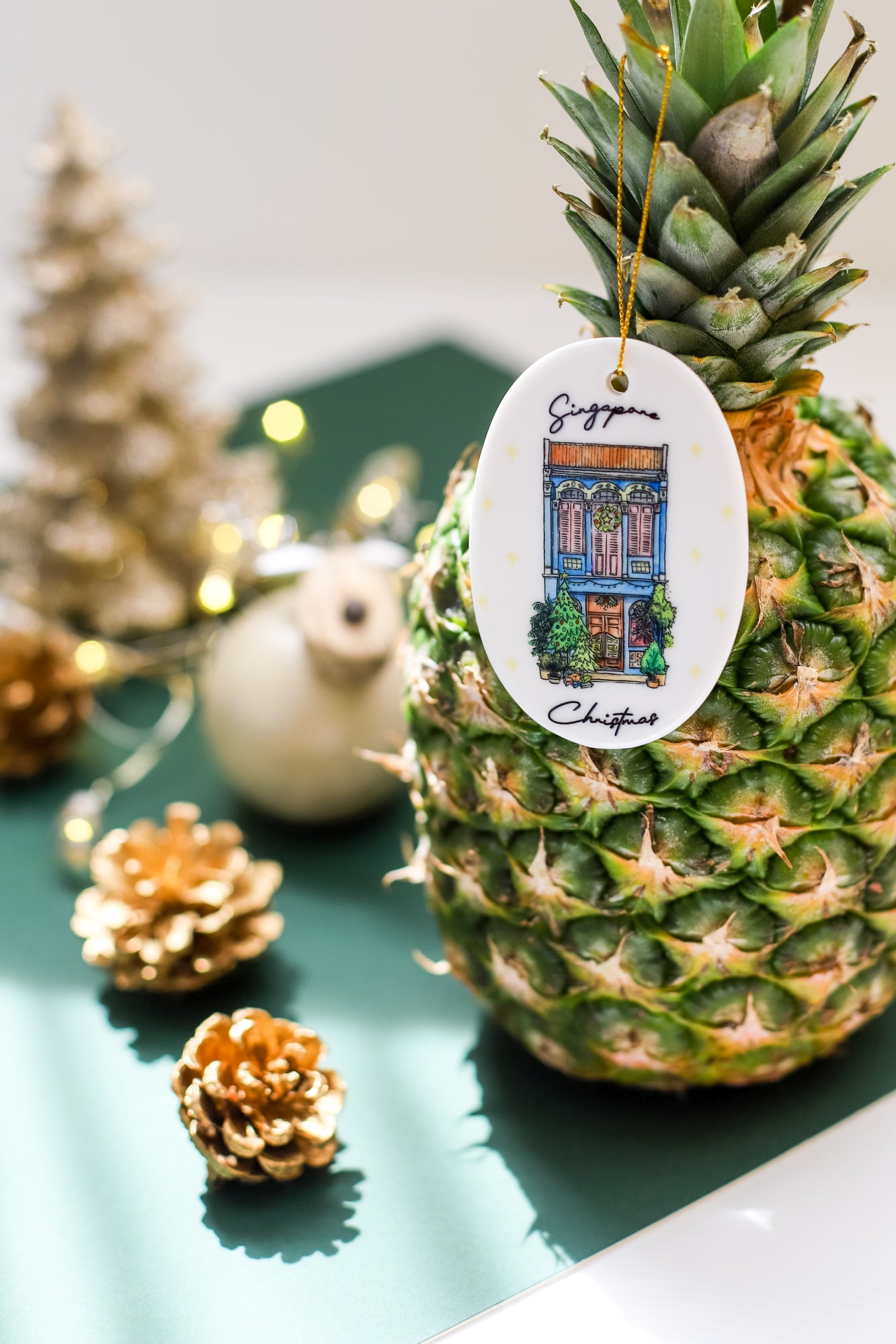 Oval ceramic ornament measuring 2 by 3 inch. This is from a series of 4 Peranakan houses. Can be bought separately or as a complete set.