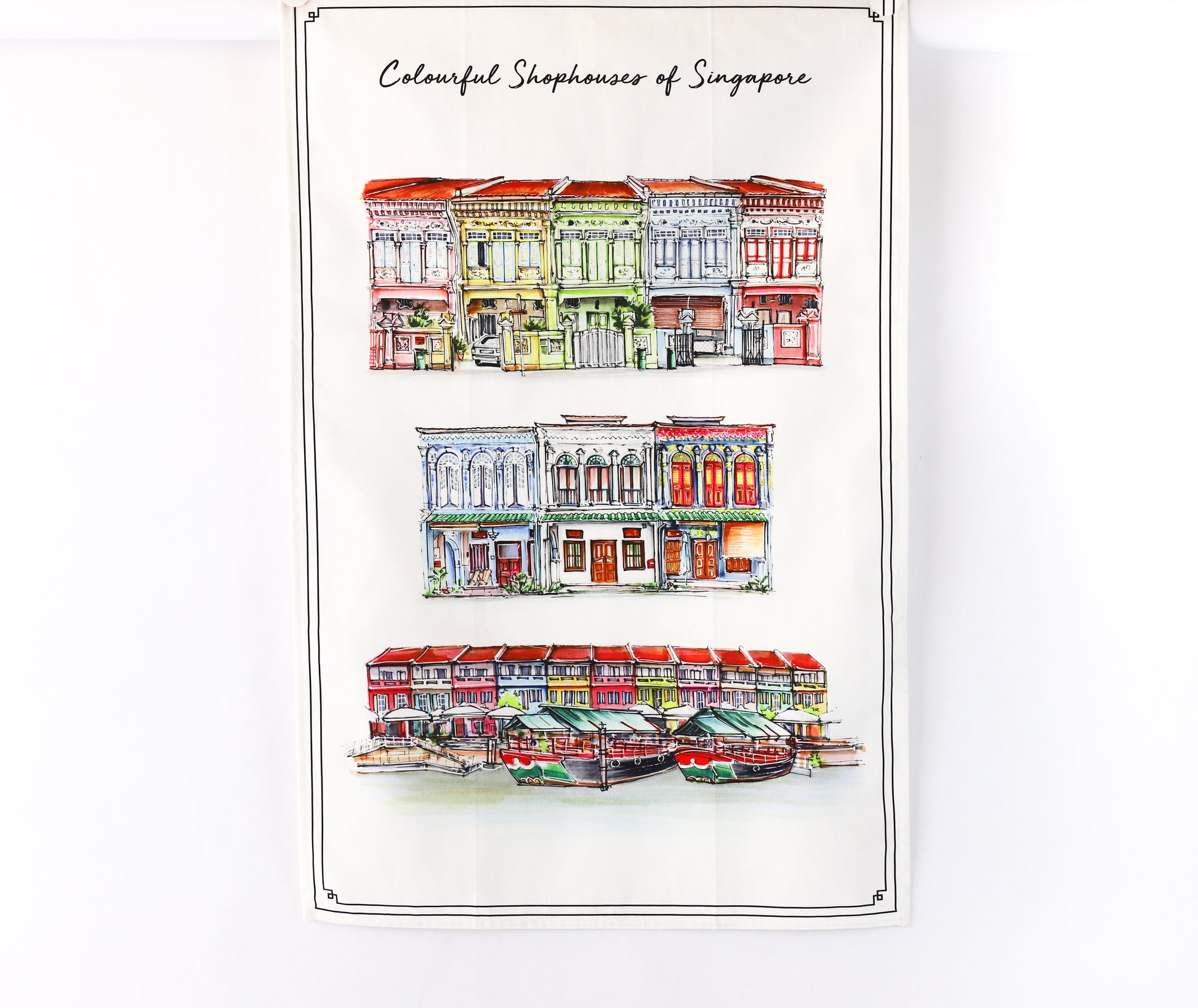 A beautifully decorated organic cotton tea towel 40x60 cm from Gingerlily - featuring illustrations of colourful shophouses of Singapore.