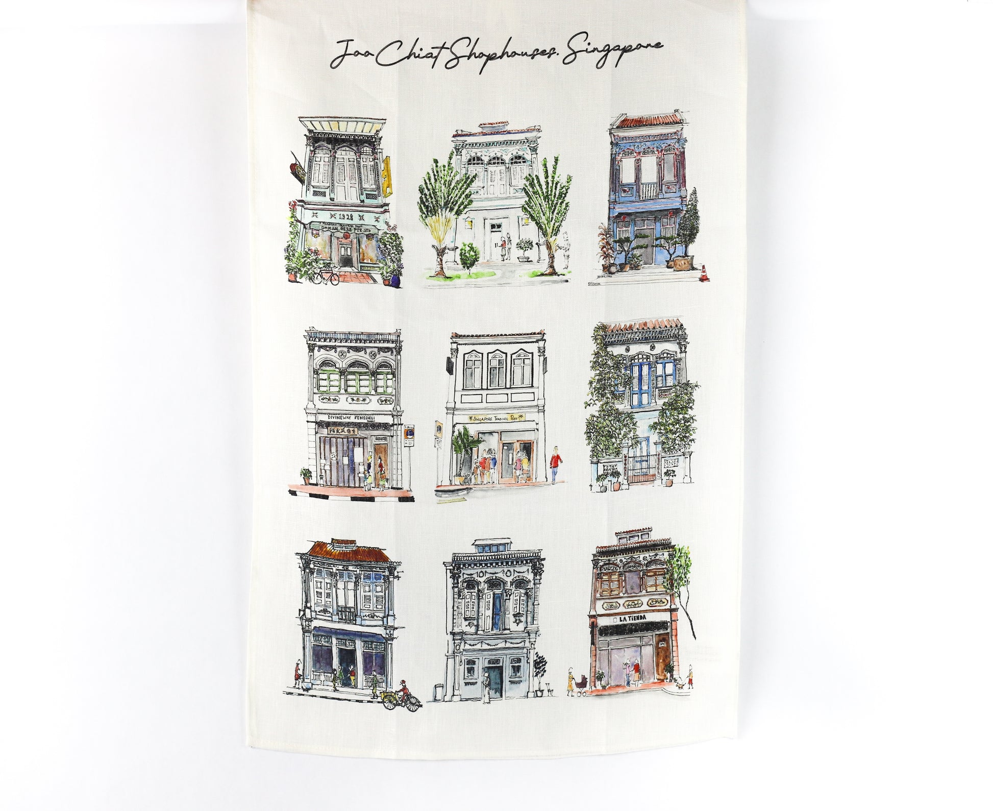 A beautifully decorated organic cotton tea towel 40x60 cm from Gingerlily - featuring illustrations of Joo Chiat shophouses of Singapore.