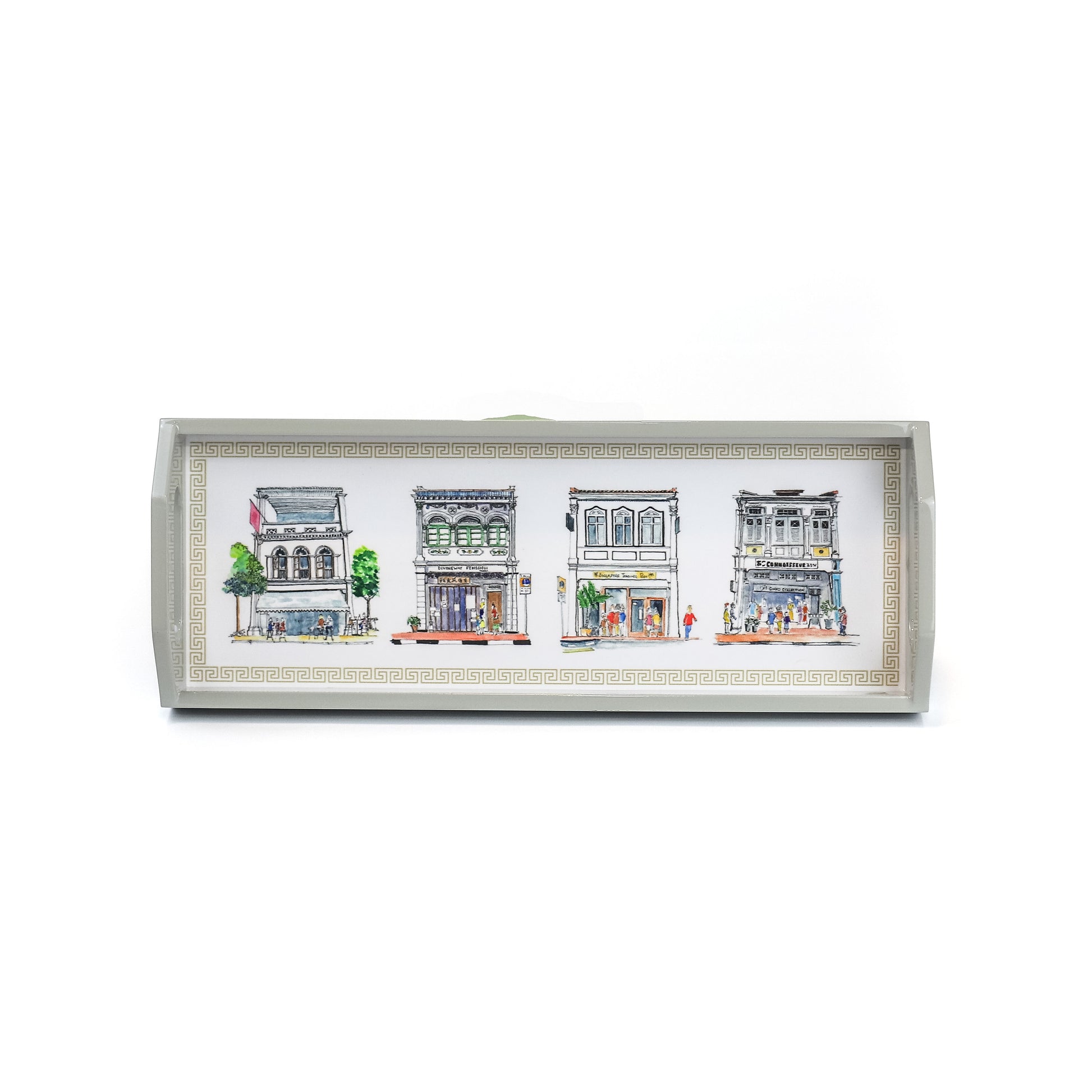 Grey Oblong Lacquer Tray - Pastel Shophouses