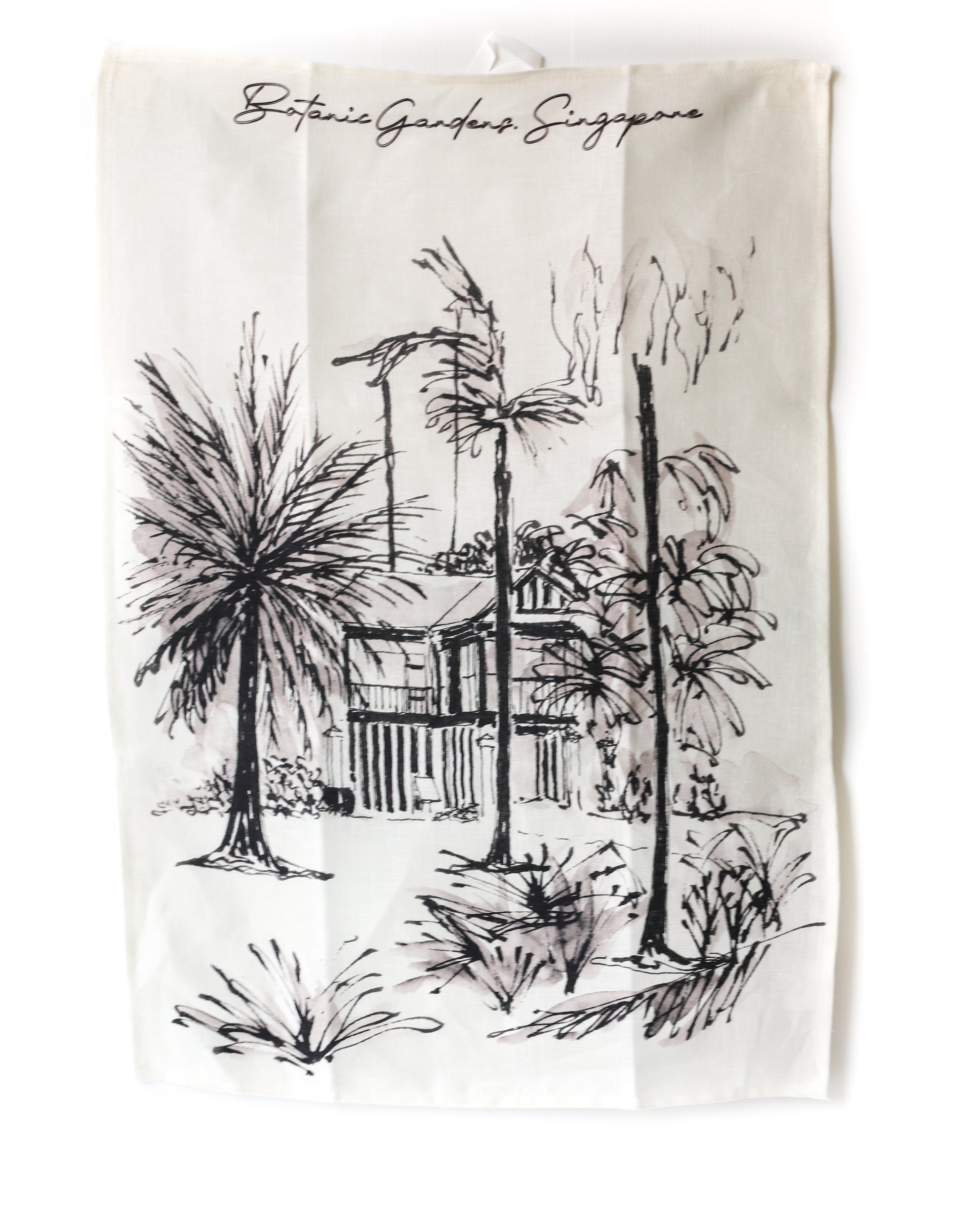 A beautifully decorated 100% linen tea towel 48 x 60 cm from Gingerlily - featuring an illustration of a heritage shophouse in the Singapore Botanical Gardens by Simon Privett