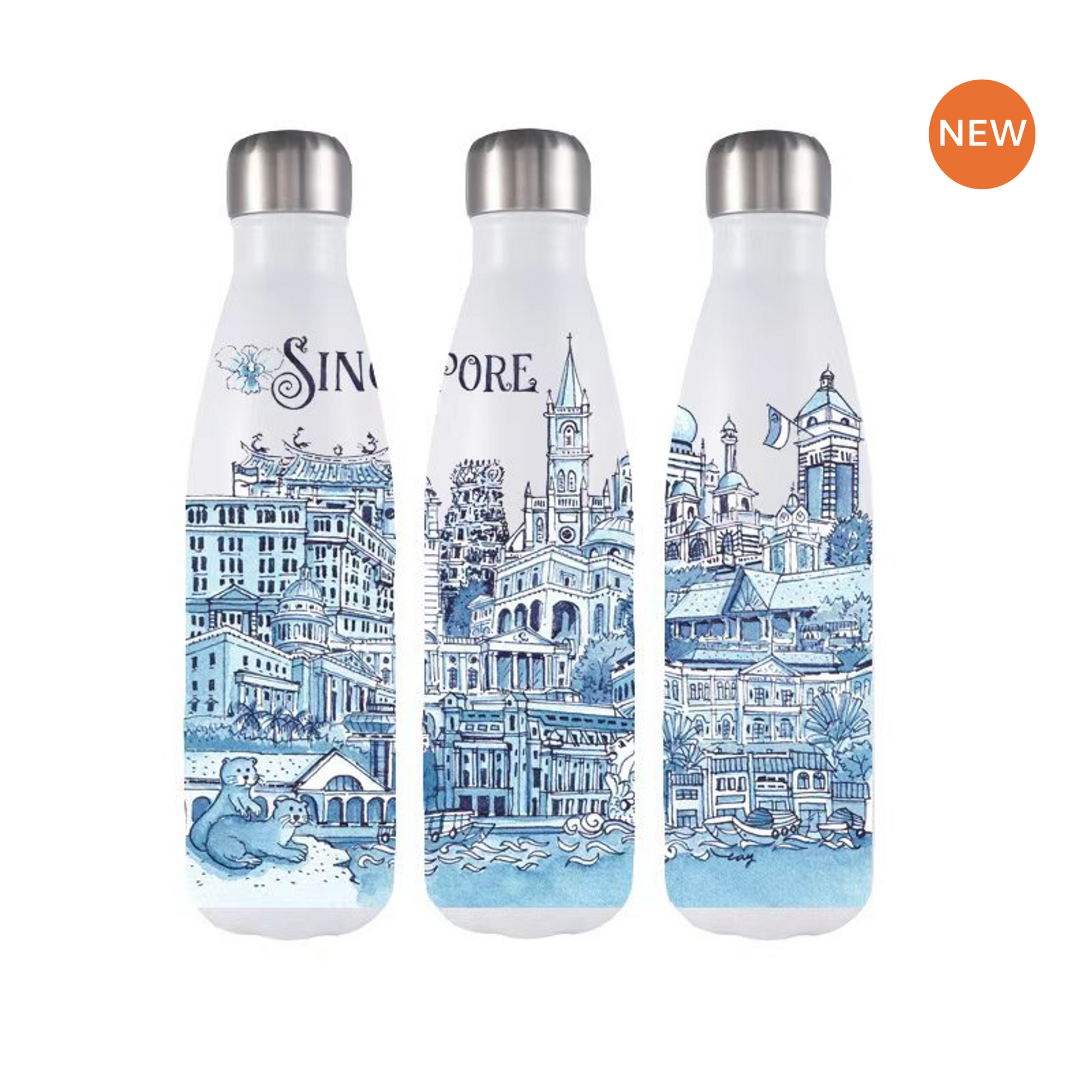 Double wall stainless steel insulated BPA free bottle featuring Myraid of Singapore. Can keep warm / cold water for a long time.