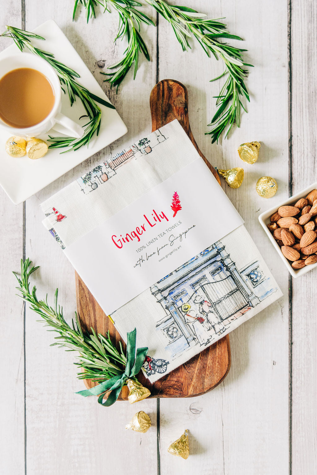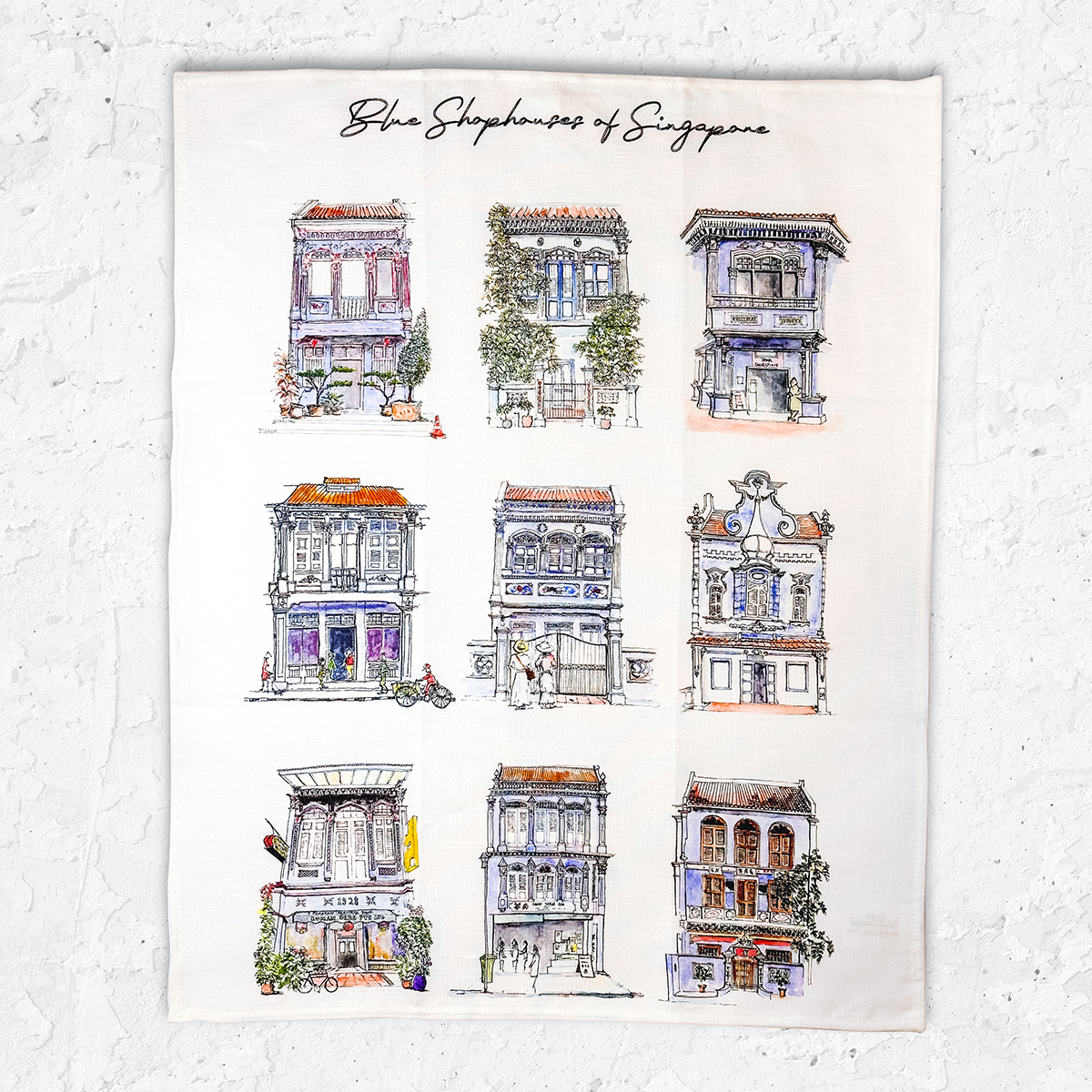 100% linen teatowels featuring our blue shophouses 48 x 60 cm.
