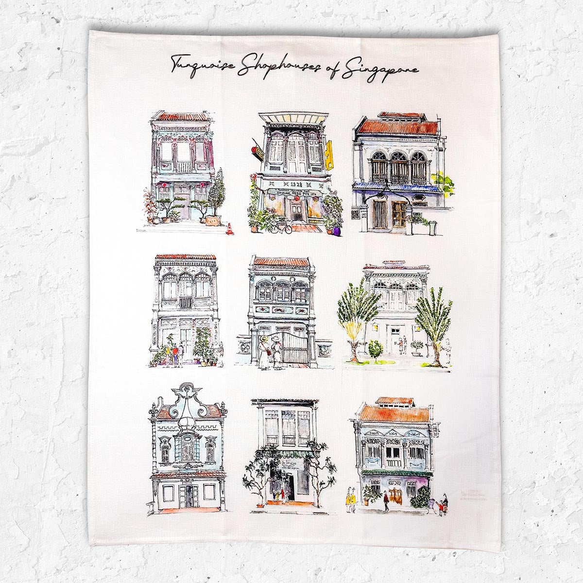 100% linen teatowels featuring our tourquoise shophouses 48 x 60 cm.