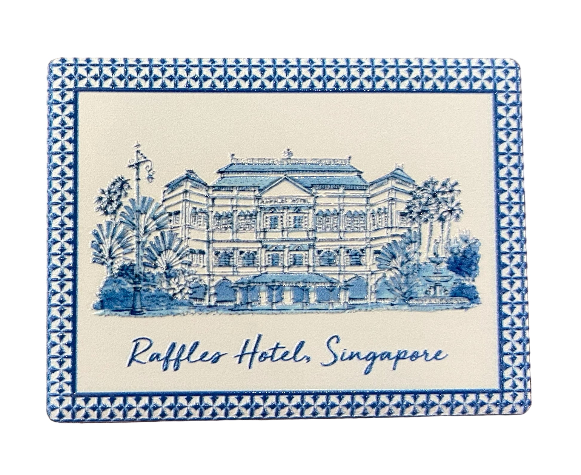 Raffles Hotel & Singapore Skyline in blue and white, newly illustrated Merlion which captures the playful spirit and signature Koon Seng row of painted beautiful shophouses.
