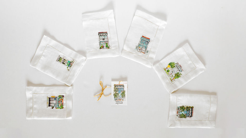 22X15cm - High quality French linen hemstitched napkins with that special Singapore touch. They can be used for cocktails or starters before dinner proper in the garden/patio/balcony. These cream-colored napkins are printed with 6 stunning hand drawn shophouse illustrations that we have carefully curated. Illustrations by Simon Privett.