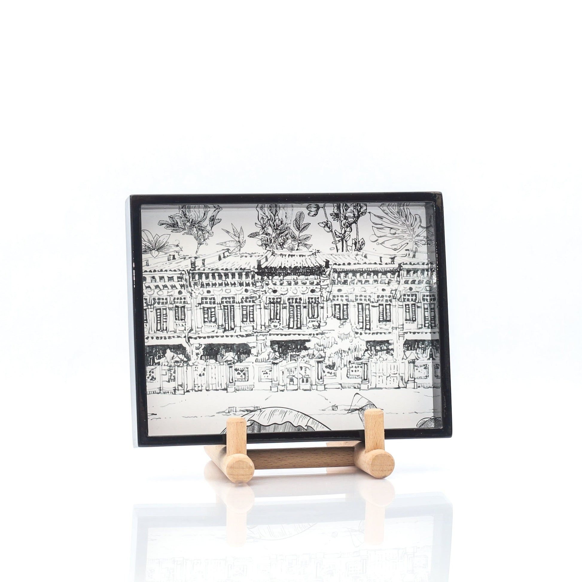 This black lacquer trinket tray is manufactured from Vietnam. It will make a fabulous timeless gift or for personal usage - handy at the entrance of the house to leave your keys and nick nacks. The illustrations on the tray ia that Koon Seng shophouses from our collection. The detailing of our hand drawn shophouses are beautifully captured here.
