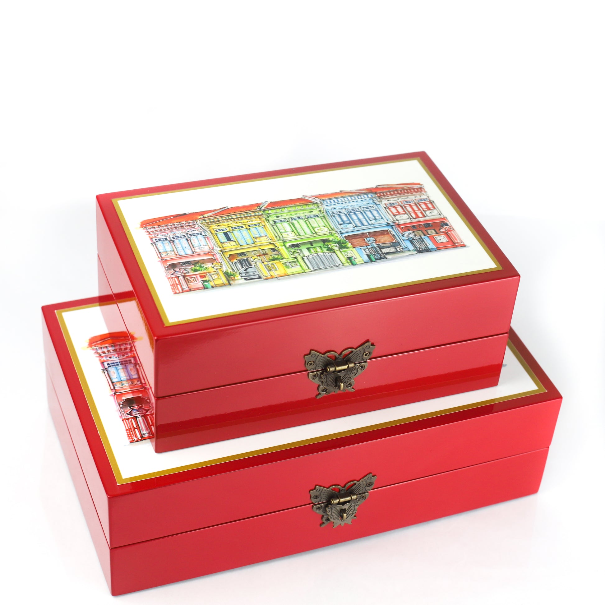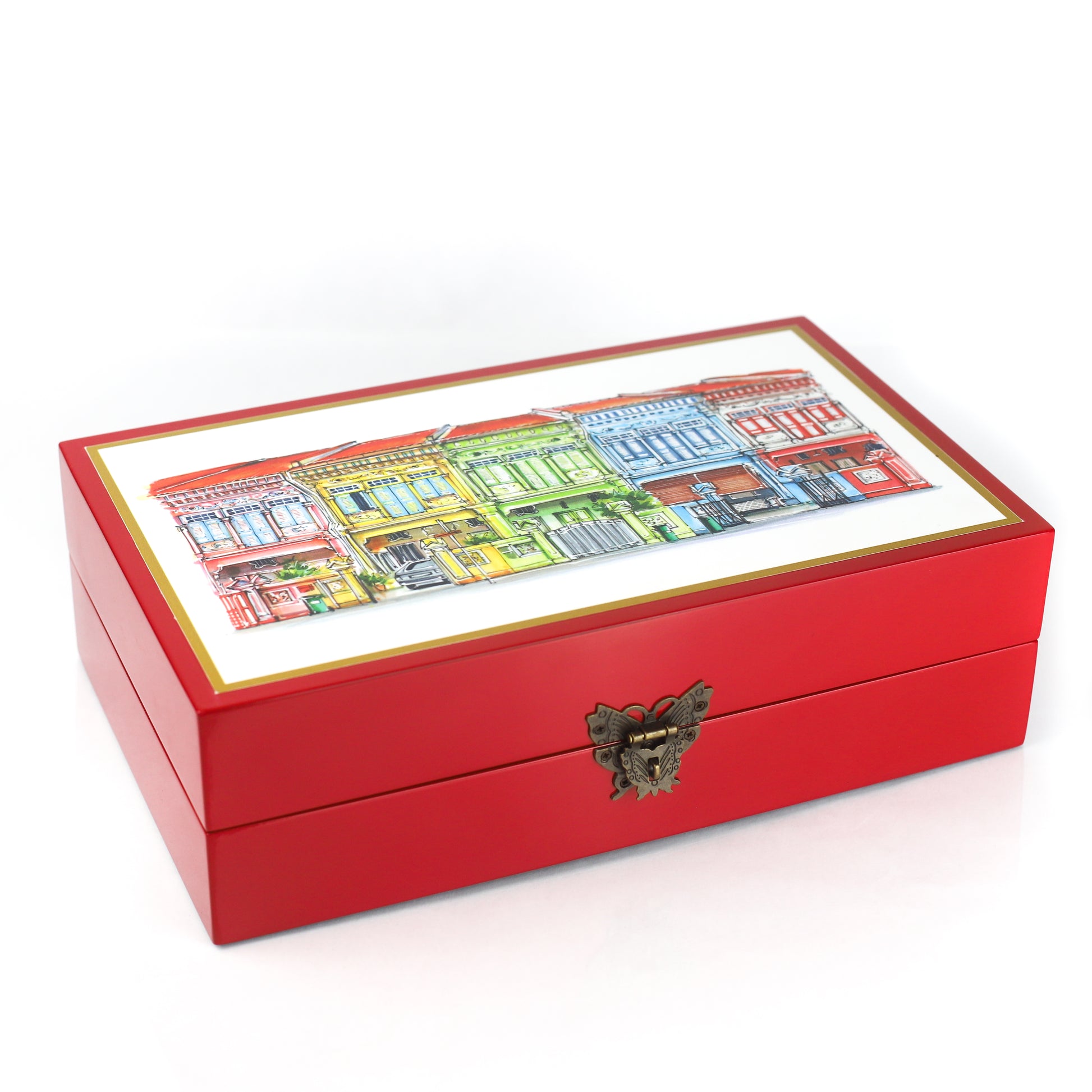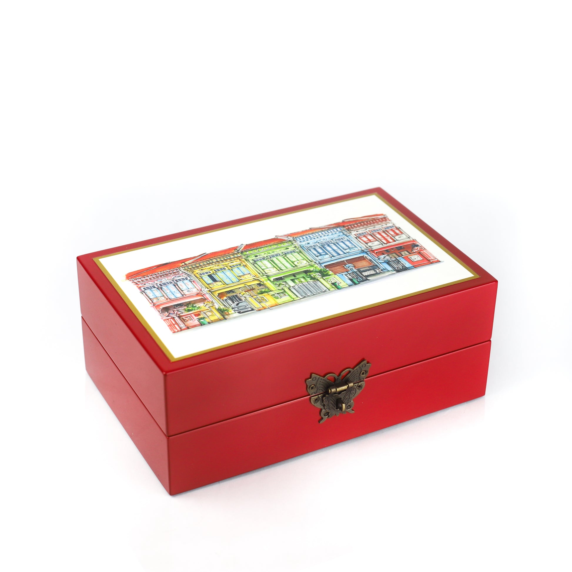 Featuring our red memory box with Koon Seng shophouse illustration. Can be used as jewellery storage, teabox to store beautiful memories of Singapore.
