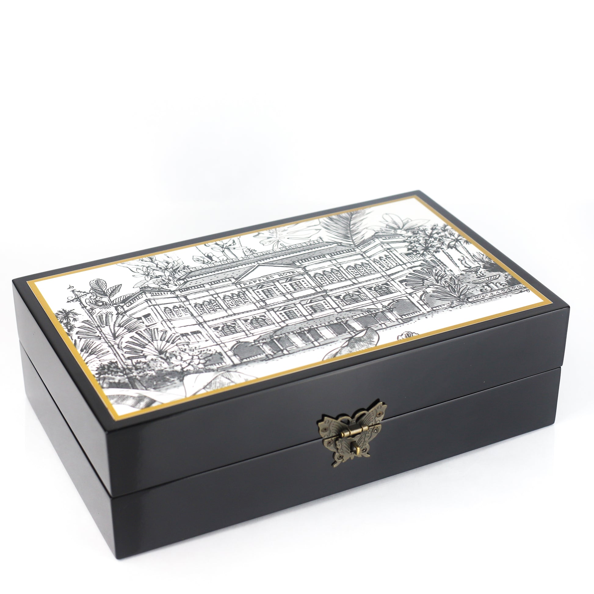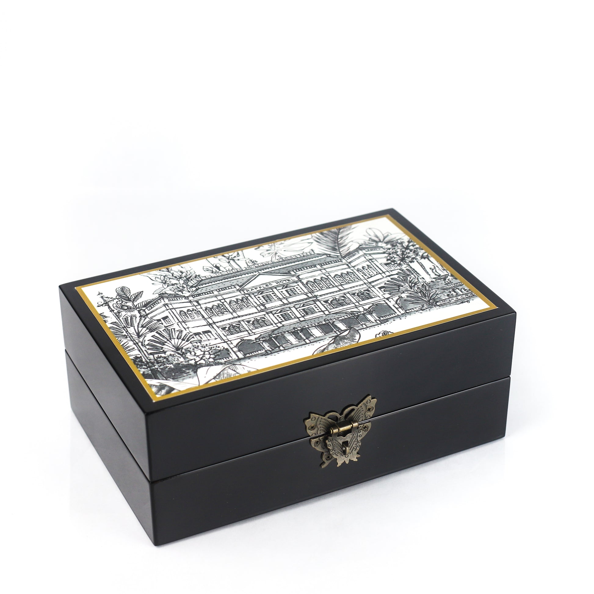 Featuring our Raffles black and white memory box Can be used as jewellery storage, teabox to store beautiful memories of Singapore.