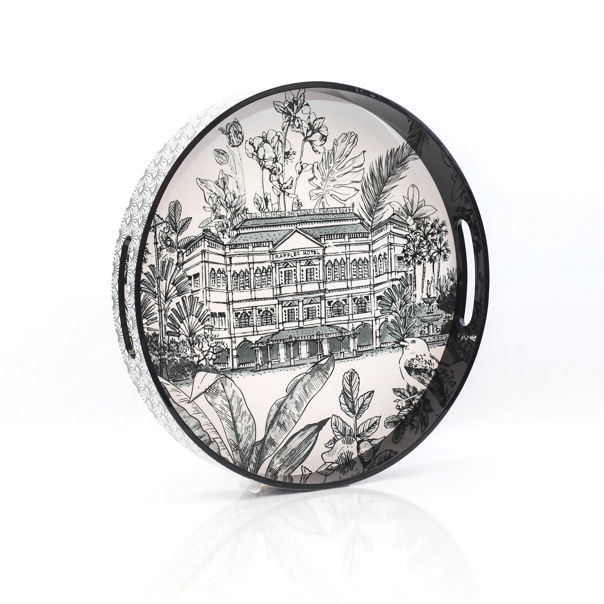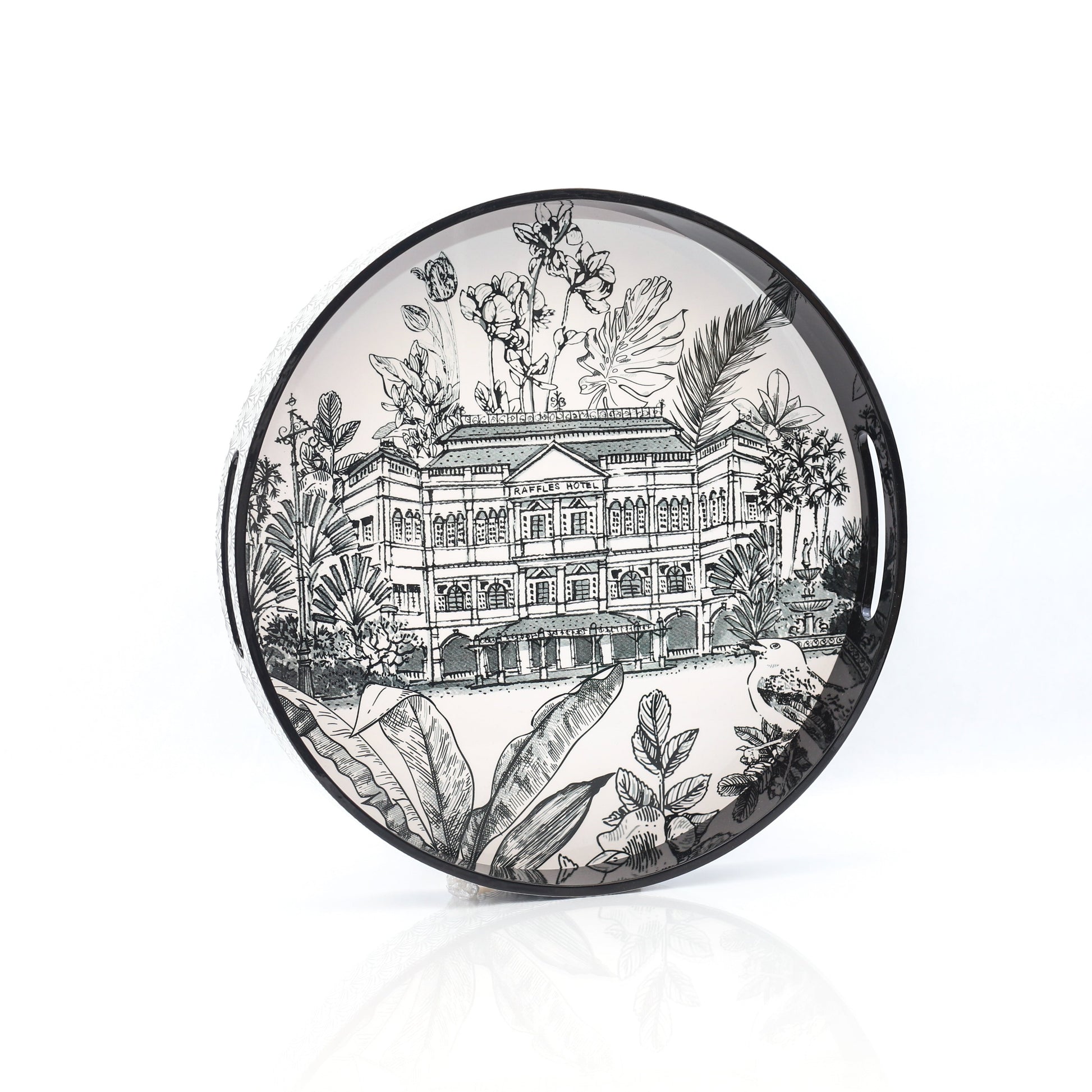 Round black patterned Tray with black and white illustration of Raffles Hotel with scallop patterns on the border. Best seller!