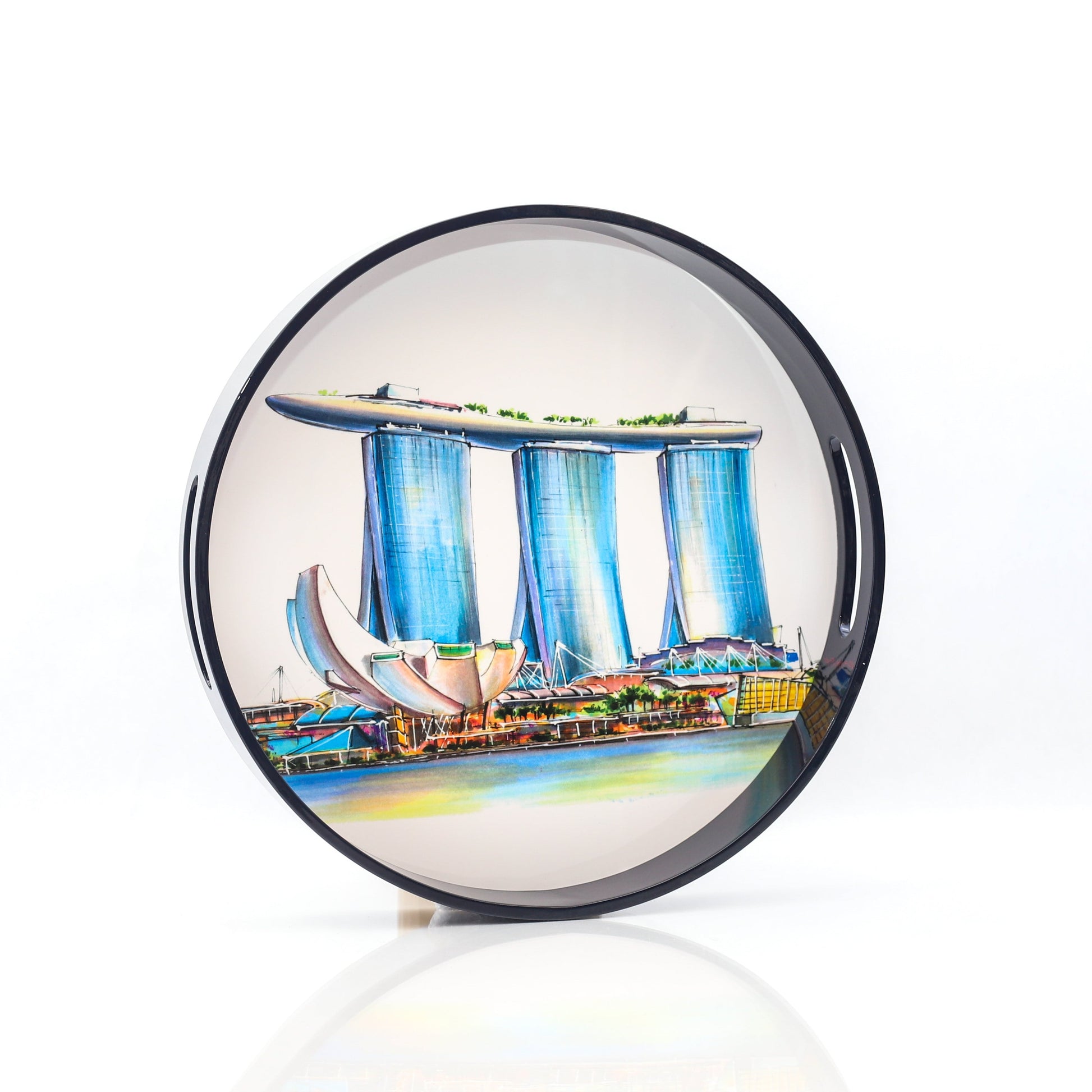 30cm Round navy tray with illustration of Marina Bay Sands.