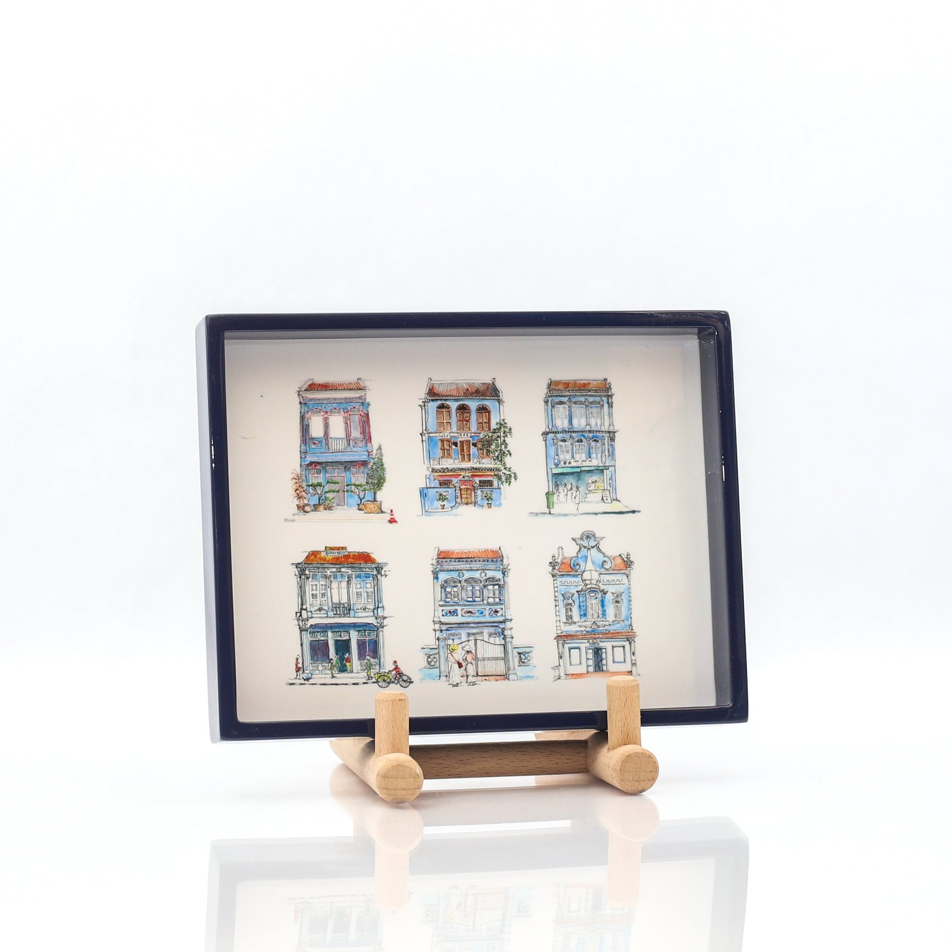 This navy lacquer trinket tray is manufactured from Vietnam. It will make a fabulous timeless gift or for personal usage - handy at the entrance of the house to leave your keys and nick nacks. The illustrations on the tray consists the best of 6 blue shophouses from our collection. The detailing of our hand drawn shophouses are beautifully captured here.