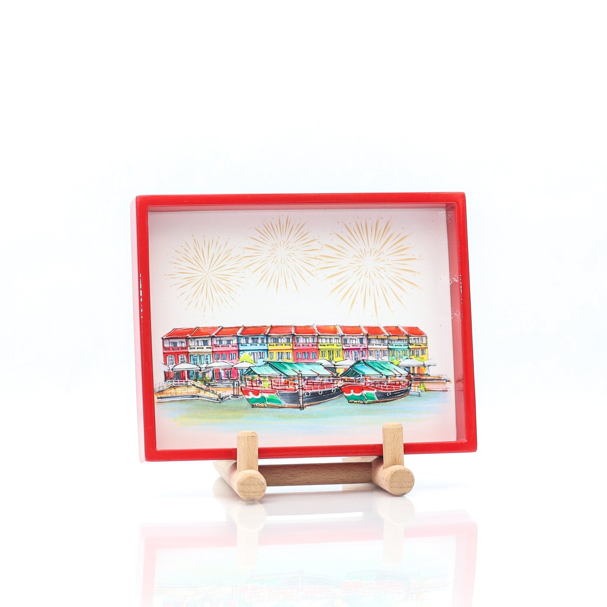 This red lacquer trinket tray is manufactured from Vietnam. It will make a fabulous timeless gift or for personal usage - handy at the entrance of the house to leave your keys and nick nacks. The illustrations on the tray is that of Clark Quay from our collection. The detailing of our hand drawn shophouses are beautifully captured here.