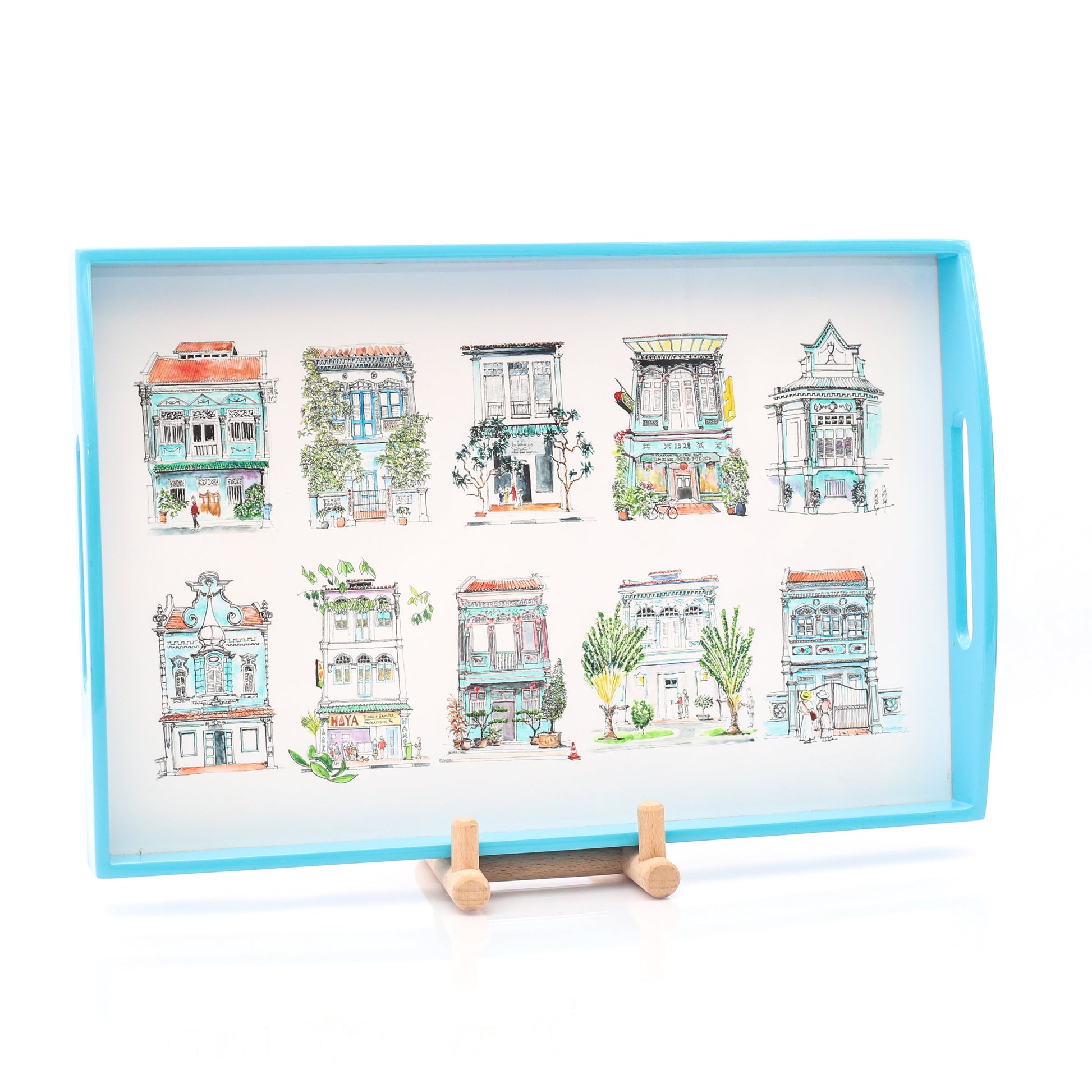 This turquoise lacquer tray manufactured from Vietnam is a show stopping piece for your home and it is made to last. It will make a fabulous timeless gift - be it a welcome, leaving or a special occasion gift. The illustrations on the tray consists the best of 10 turquoise shophouses from our collection. The detailing of our hand drawn shophouses are beautifully captured here.