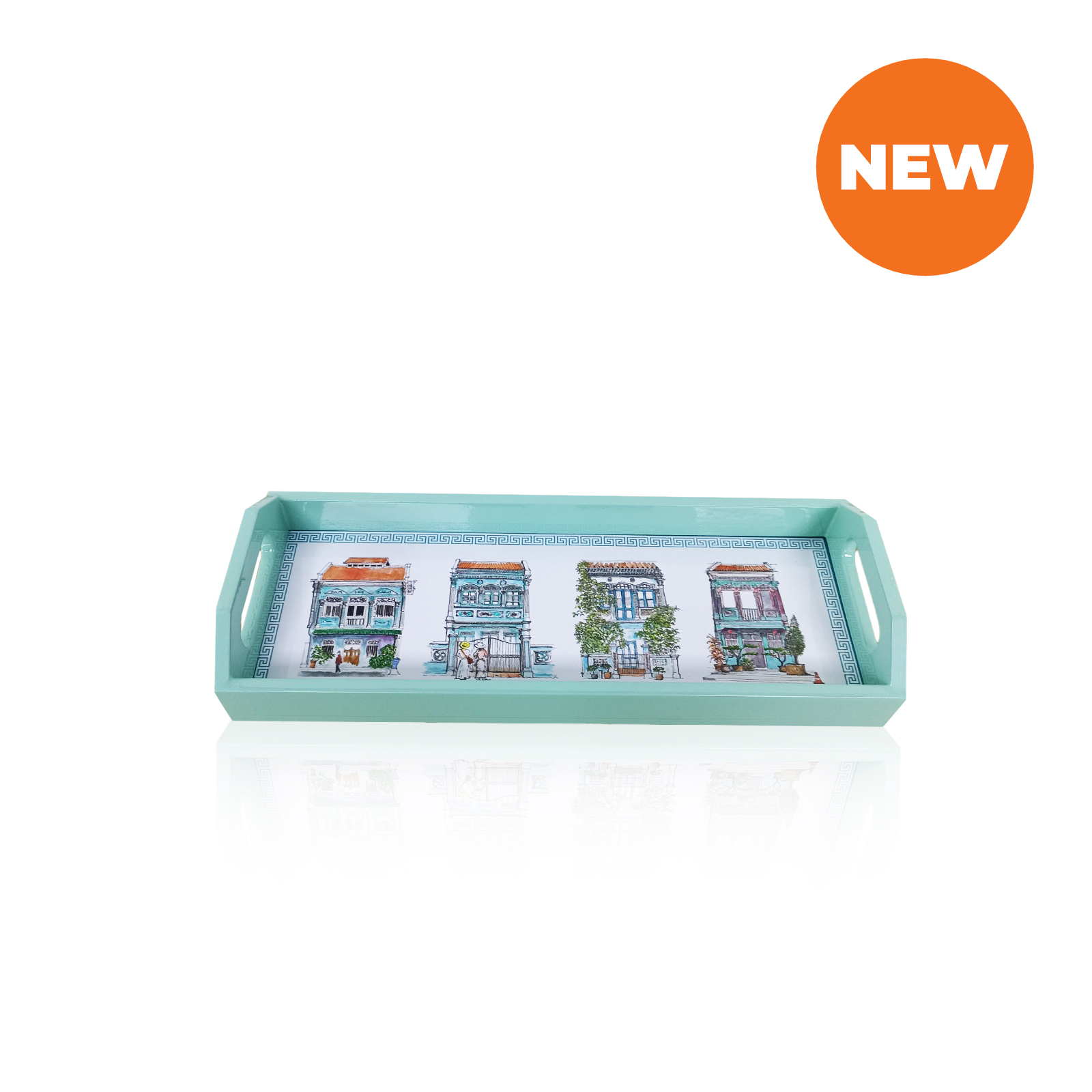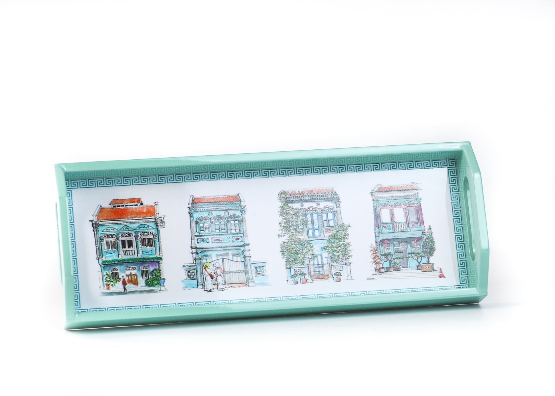This turquoise oblong lacquer tray manufactured from Vietnam is a show stopping piece for your home and it is made to last. It will make a fabulous timeless gift - be it a welcome, leaving or a special occasion gift. The illustrations on the tray consists the best of 4 turquoise shophouses from our collection. The detailing of our hand drawn shophouses are beautifully captured here.